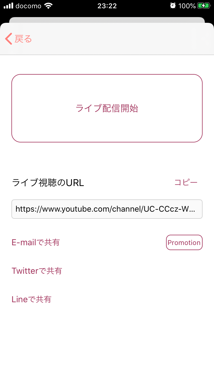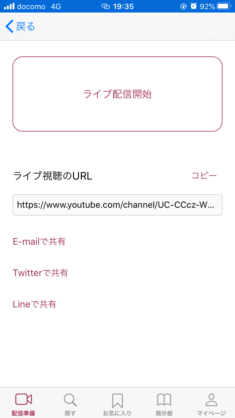 (1) ライブ配信前(左の画面のとき)に、ライブ配信のURLが表示されています。「コピー」をタップするとURLをコピーできます。E-mail、Twitter、Lineで共有することも可能です。 |