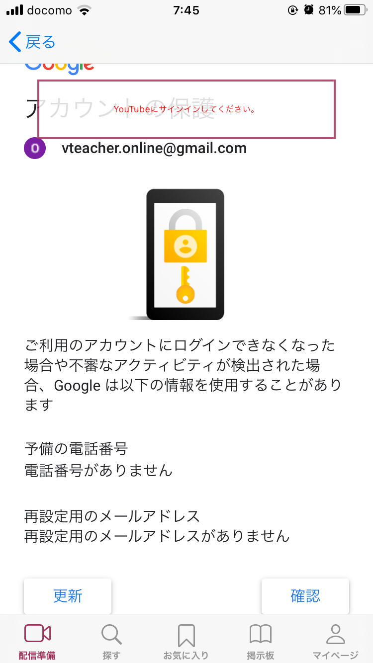 (1) はじめてYouTubeアカウントでサインインした場合、このような画面になる場合がありますが、「確認」で大丈夫です。すでに設定済の場合は表示されません。 |