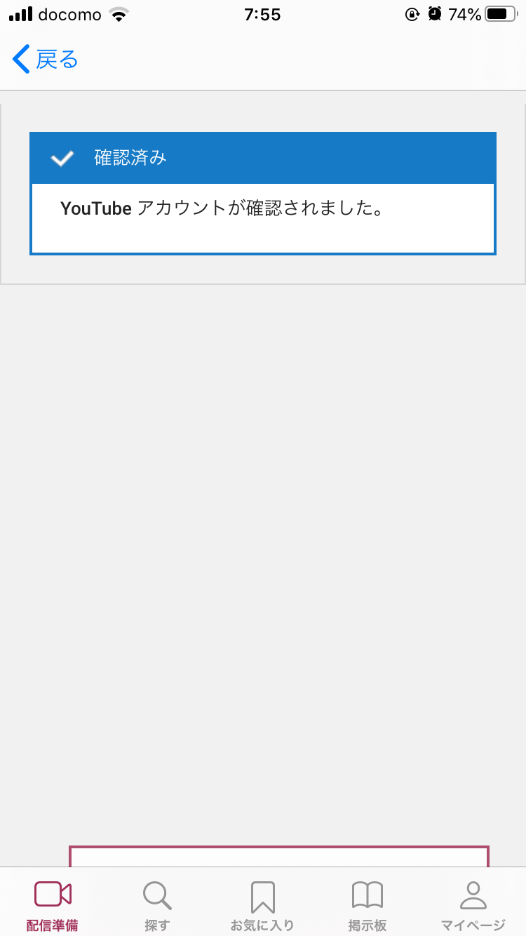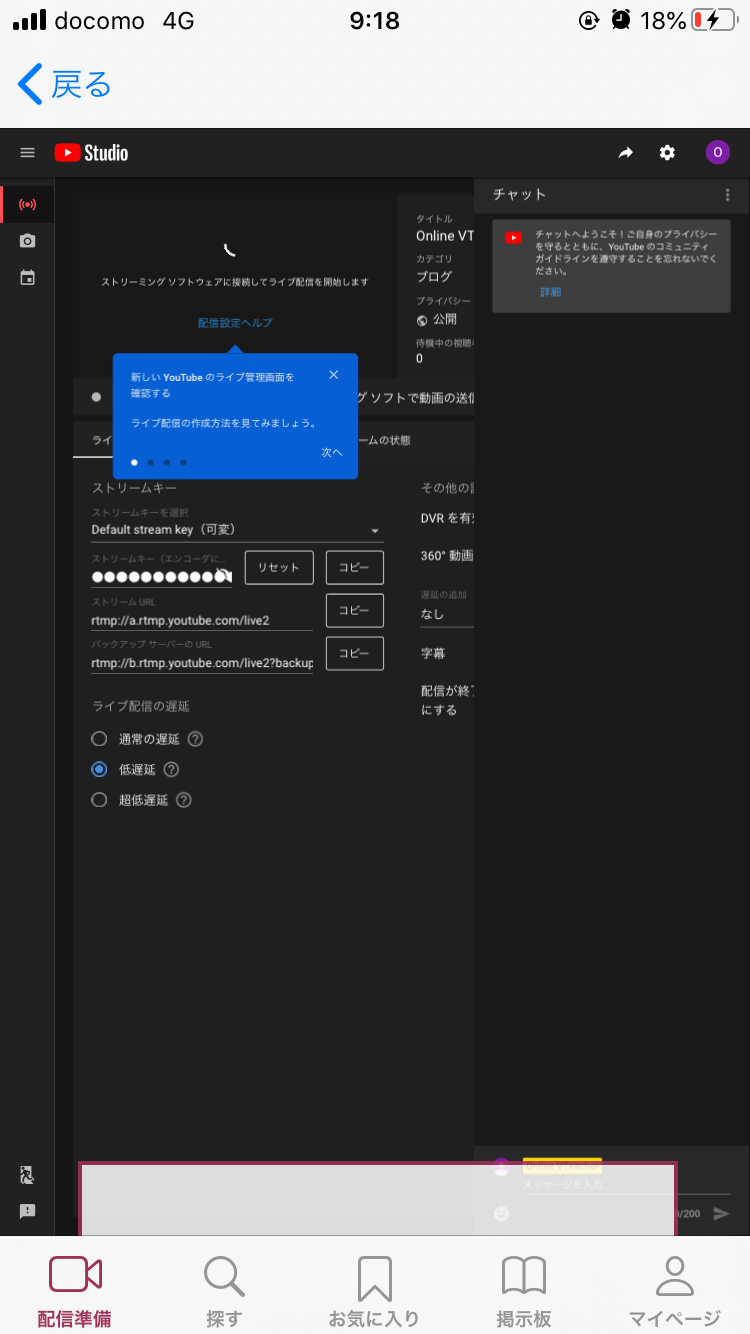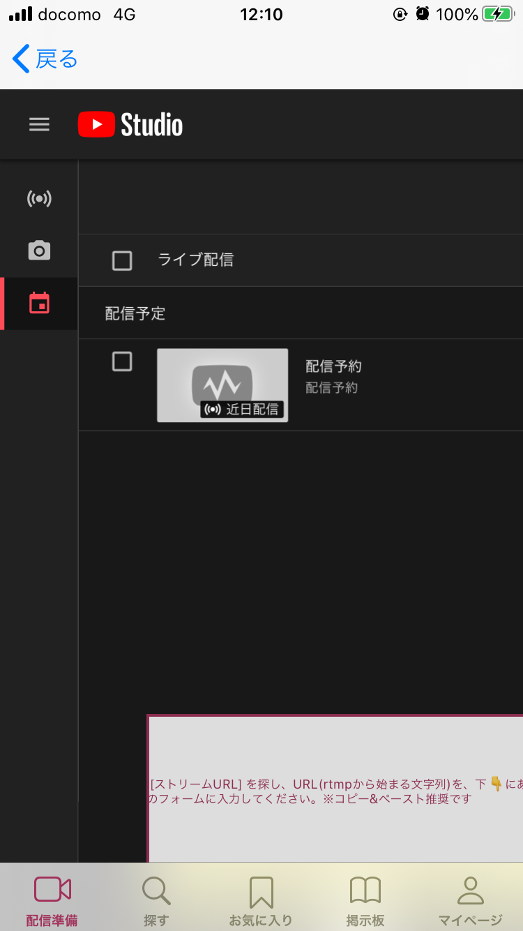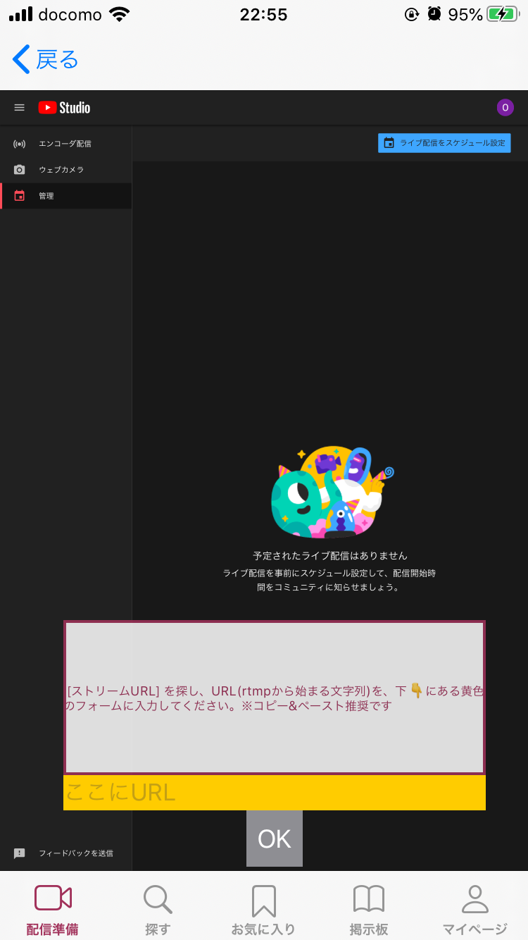 (3) YouTube管理画面が表示されます。👇の「配信準備」をタップして戻ってください。 |