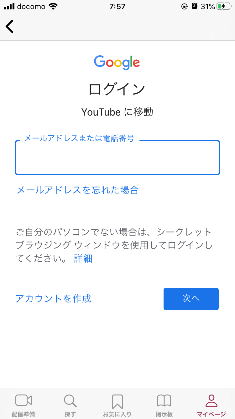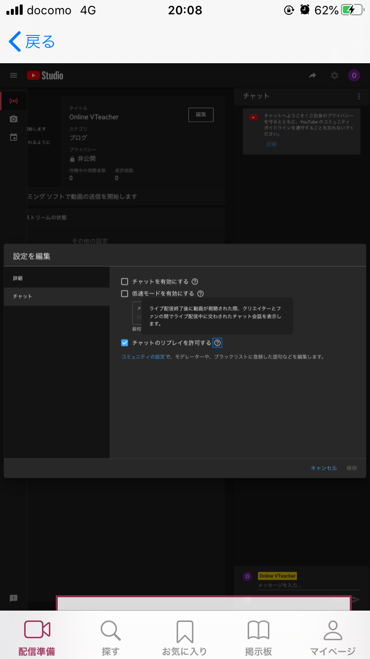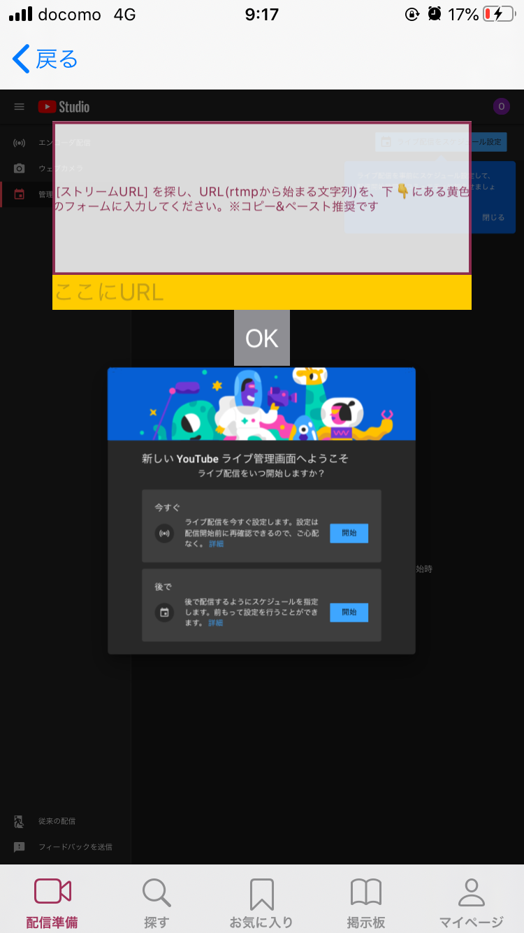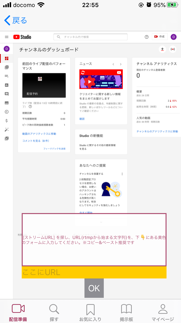 (3) YouTube管理画面が表示されます。👇の「配信準備」をタップして戻ってください。 |