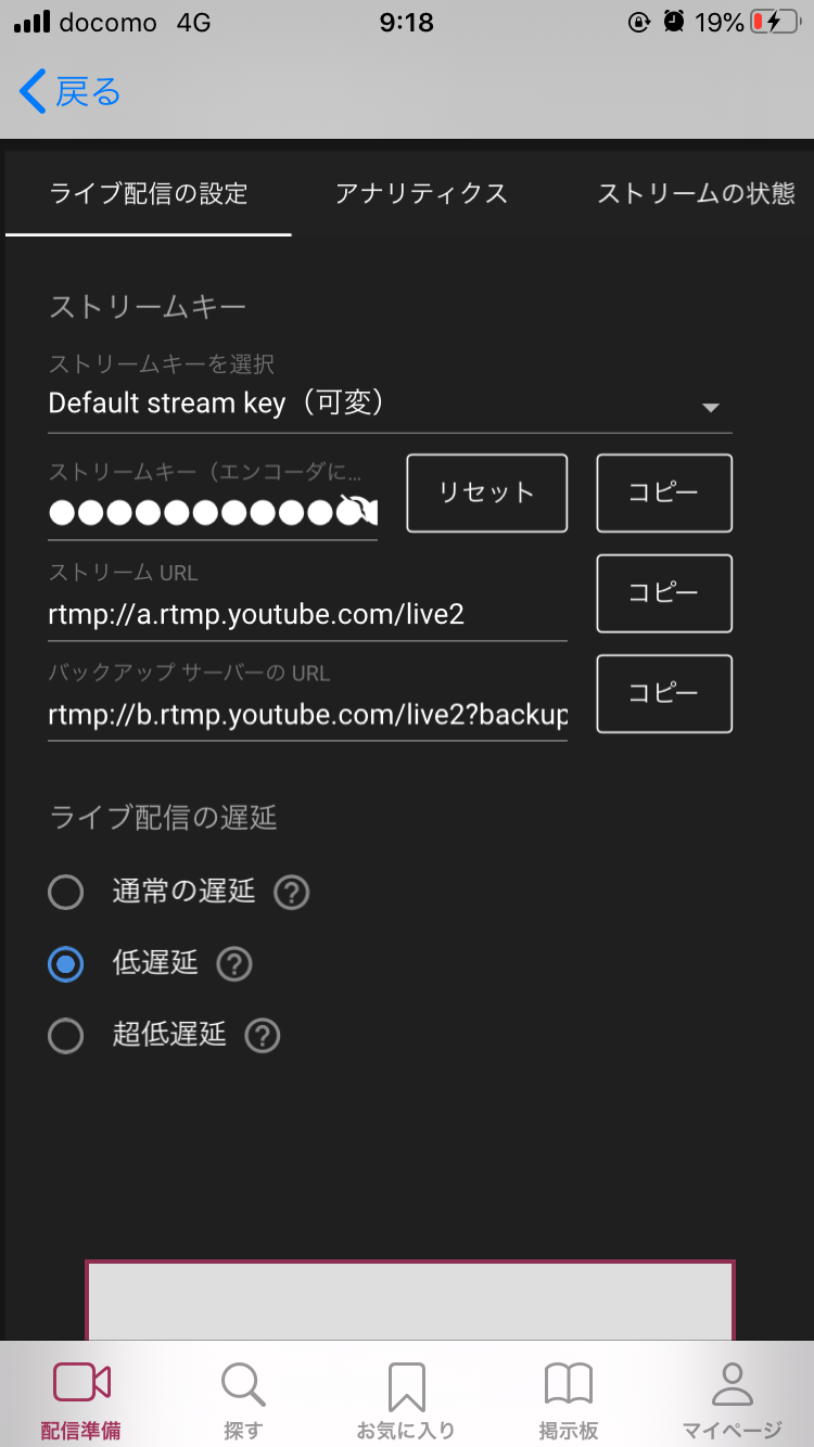 (5) ライブ配信用のURL/ストリームキーが表示されています。 |
