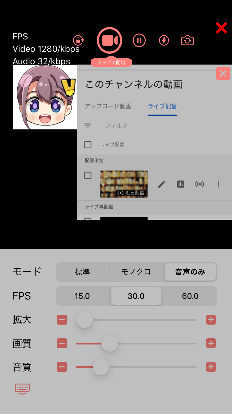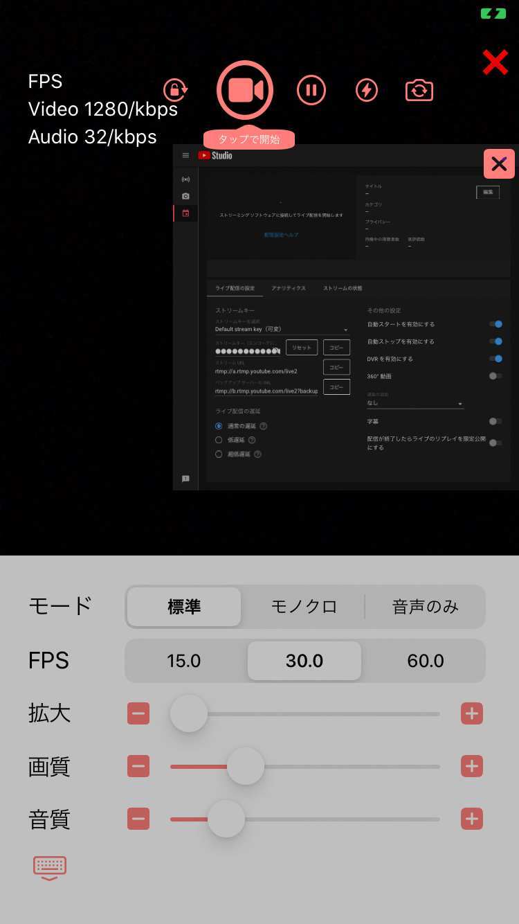 YouTubeライブができます。このアプリはエンコーダ(ストリーミングソフトウェア)のため、チャンネル登録者数は0人でも大丈夫です。最大5Mbpsの高画質配信が可能です(ネット回線状況によります)。設定手順は下記👇をご覧ください。 |